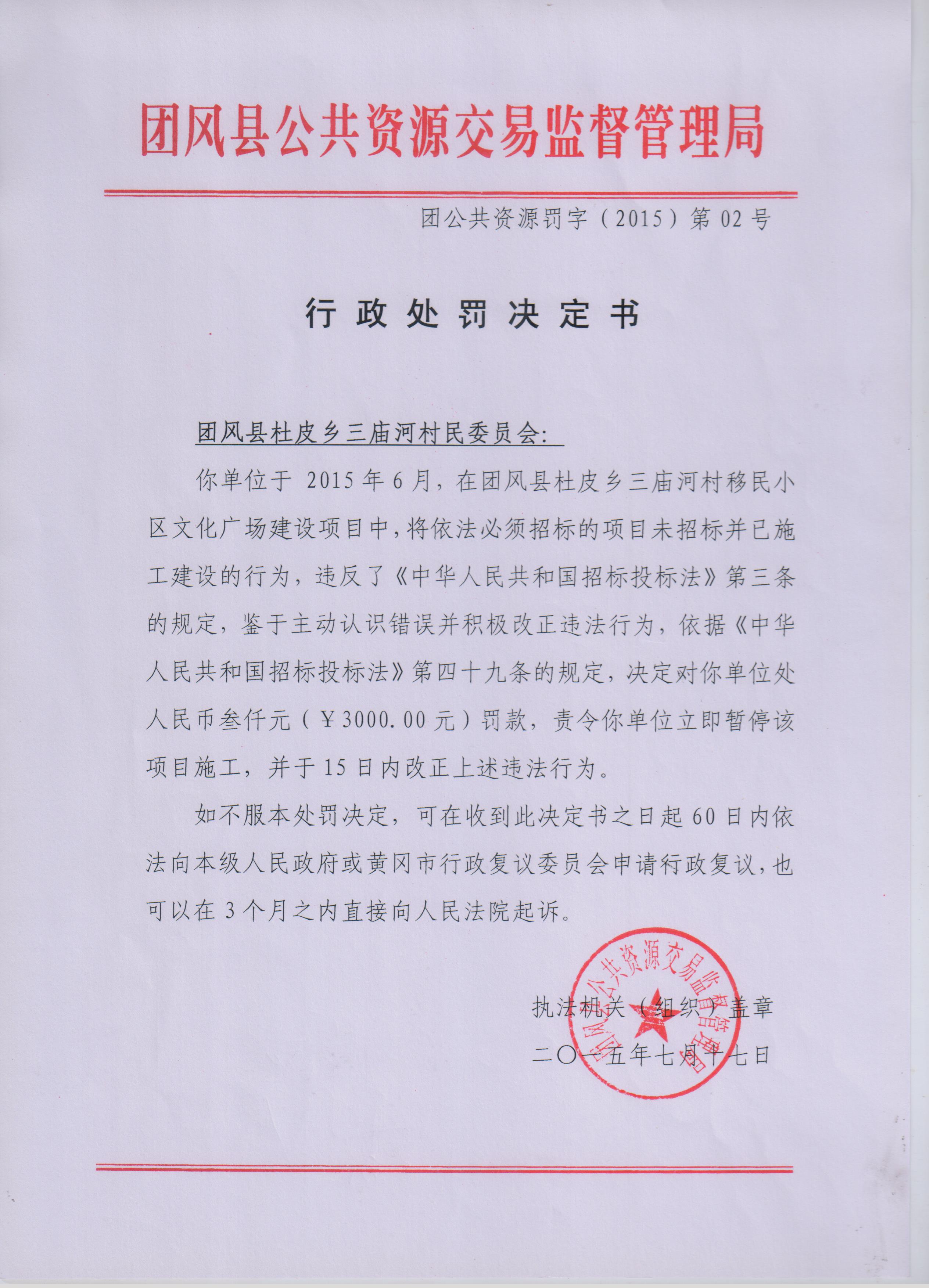 关于处罚团风县杜皮乡三庙河村民委员会行政处罚决定