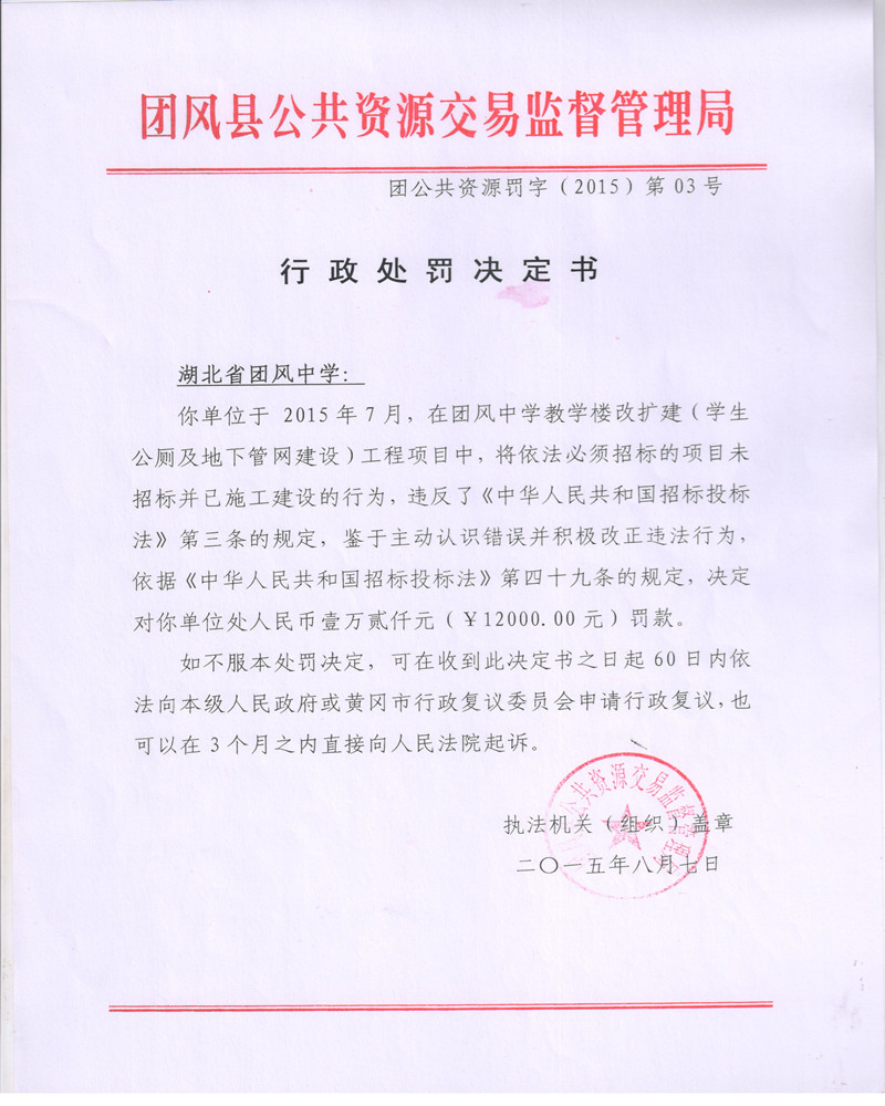 关于对湖北省团风中学的行政处罚决定书