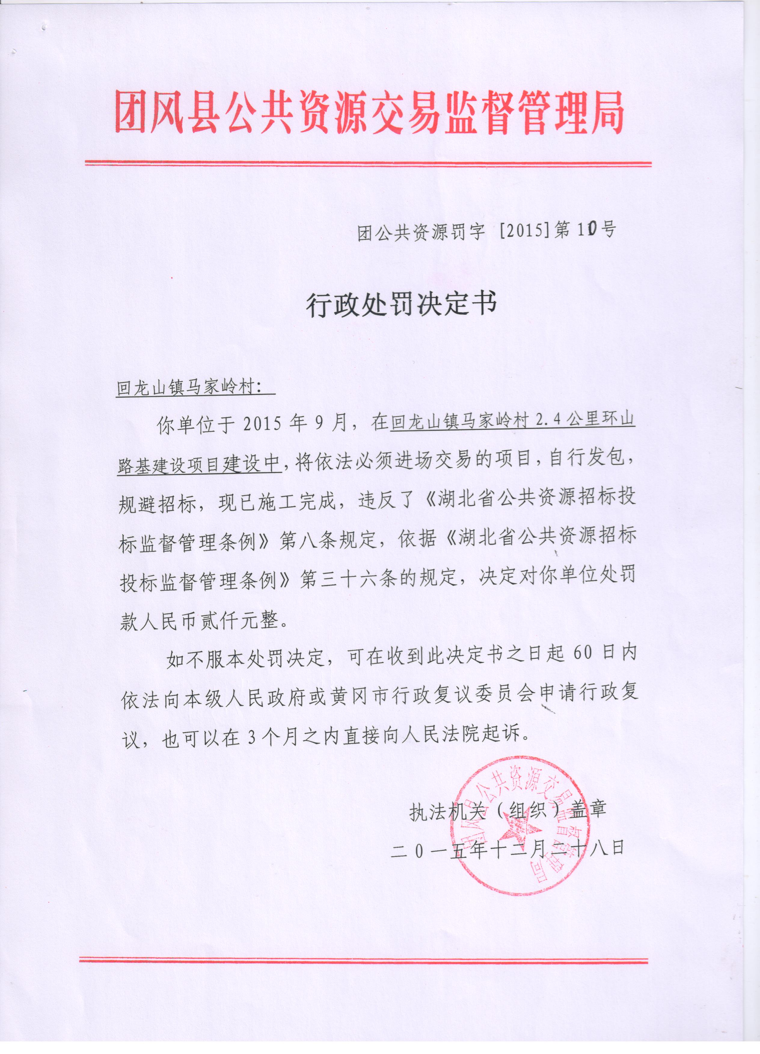关于回龙山镇马岭村的行政处罚决定书