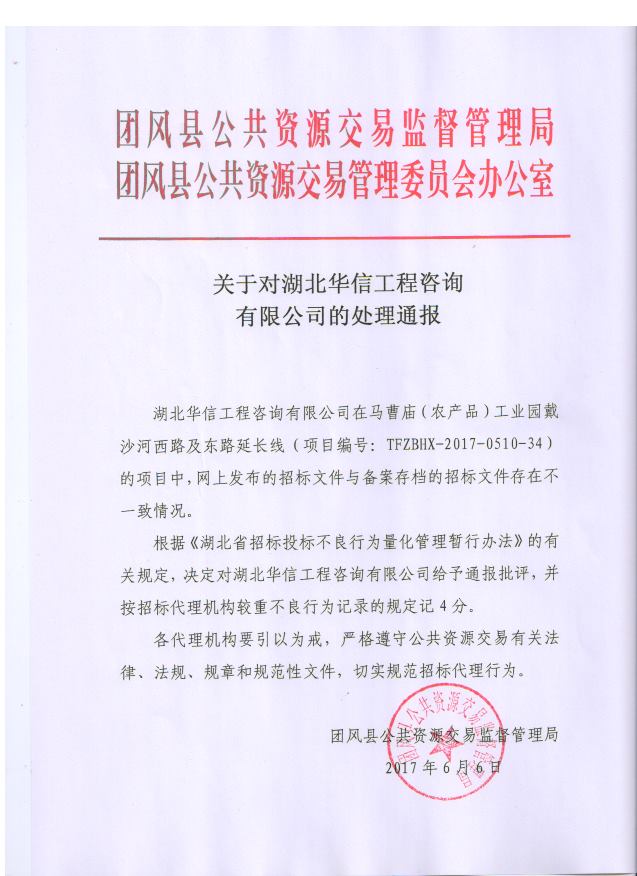 关于对湖北华信工程咨询有限公司的处理通报